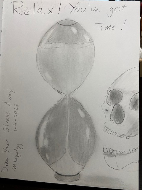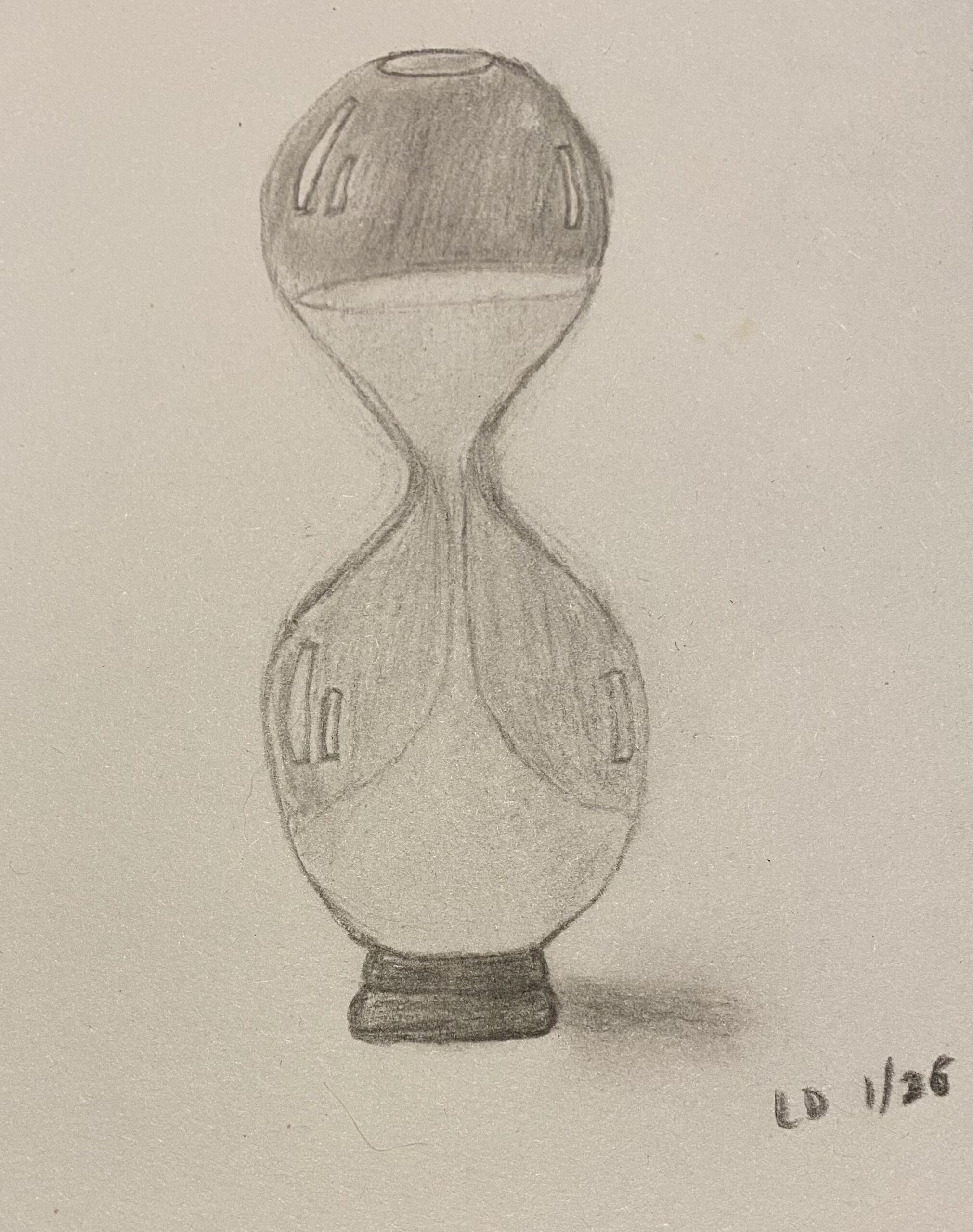 Happy New Year, Ann-Marie! We are so glad that today’s session gave you another chance to make art! Your sketch is beautiful! The curves of your hourglass are perfectly shaped, and the darker base gives it a strong sense of place on the page. Nice work!