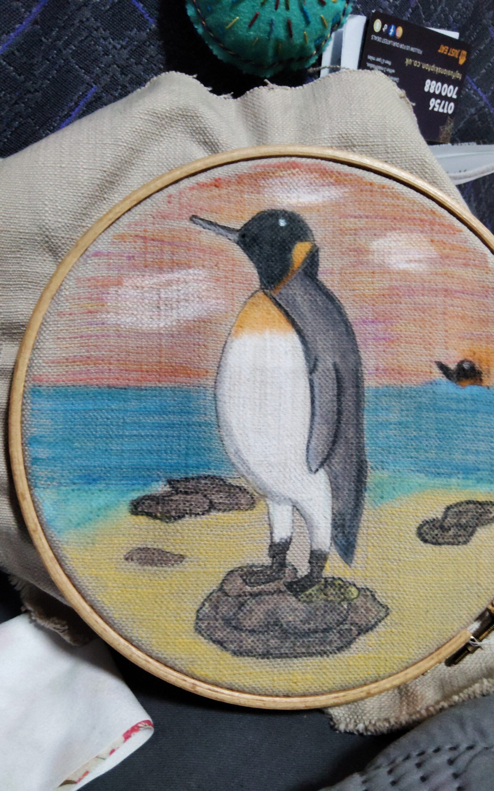 Gillian, I’m so glad you shared this here. I remember you mentioning during the live session that you were working on fabric, and it’s really wonderful to see it finished. The pastels and colors work beautifully on the fabric and give your penguin such a soft, expressive feel. Will you keep it in the embroidery loop or frame it? Or maybe you have other plans? Thank you for bringing something a little different and for sharing it with all of us.