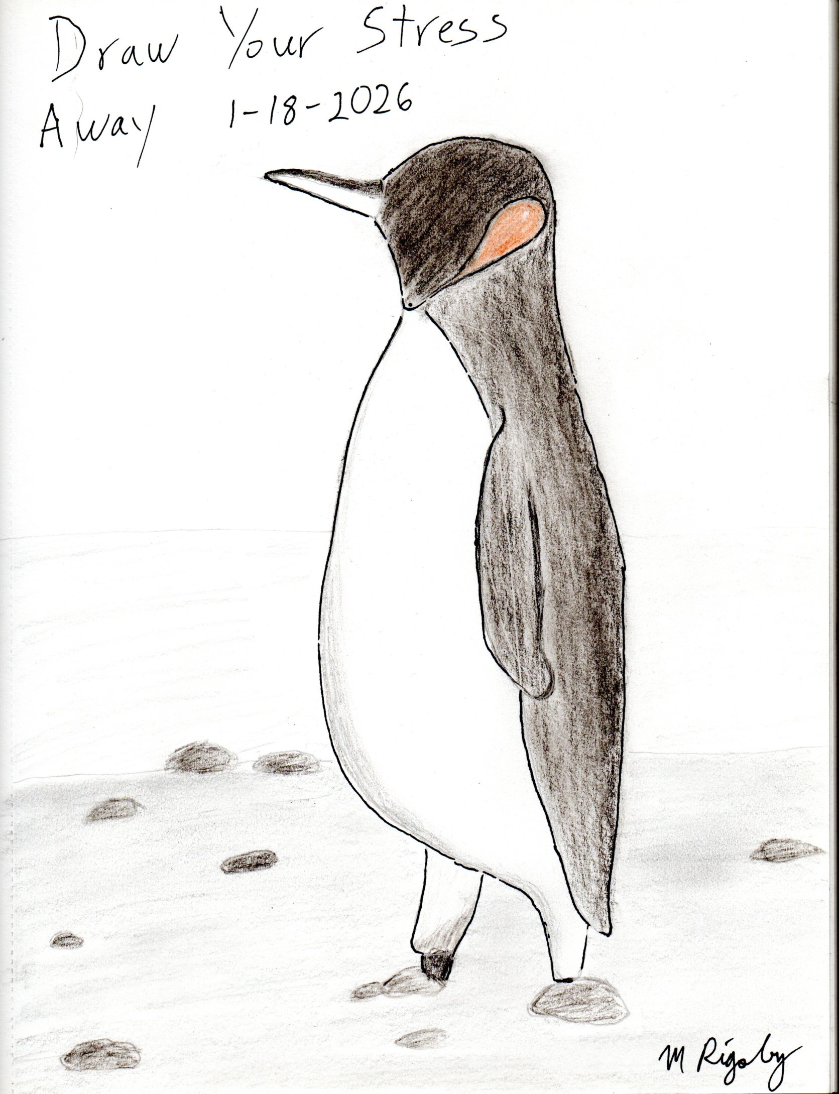 Sandra, thank you so much for being here today. I really like the way you added the shoreline with larger rocks in the background (mine were all about the same size), it gives your penguin a solid setting. I’m glad you spent this time drawing with us.