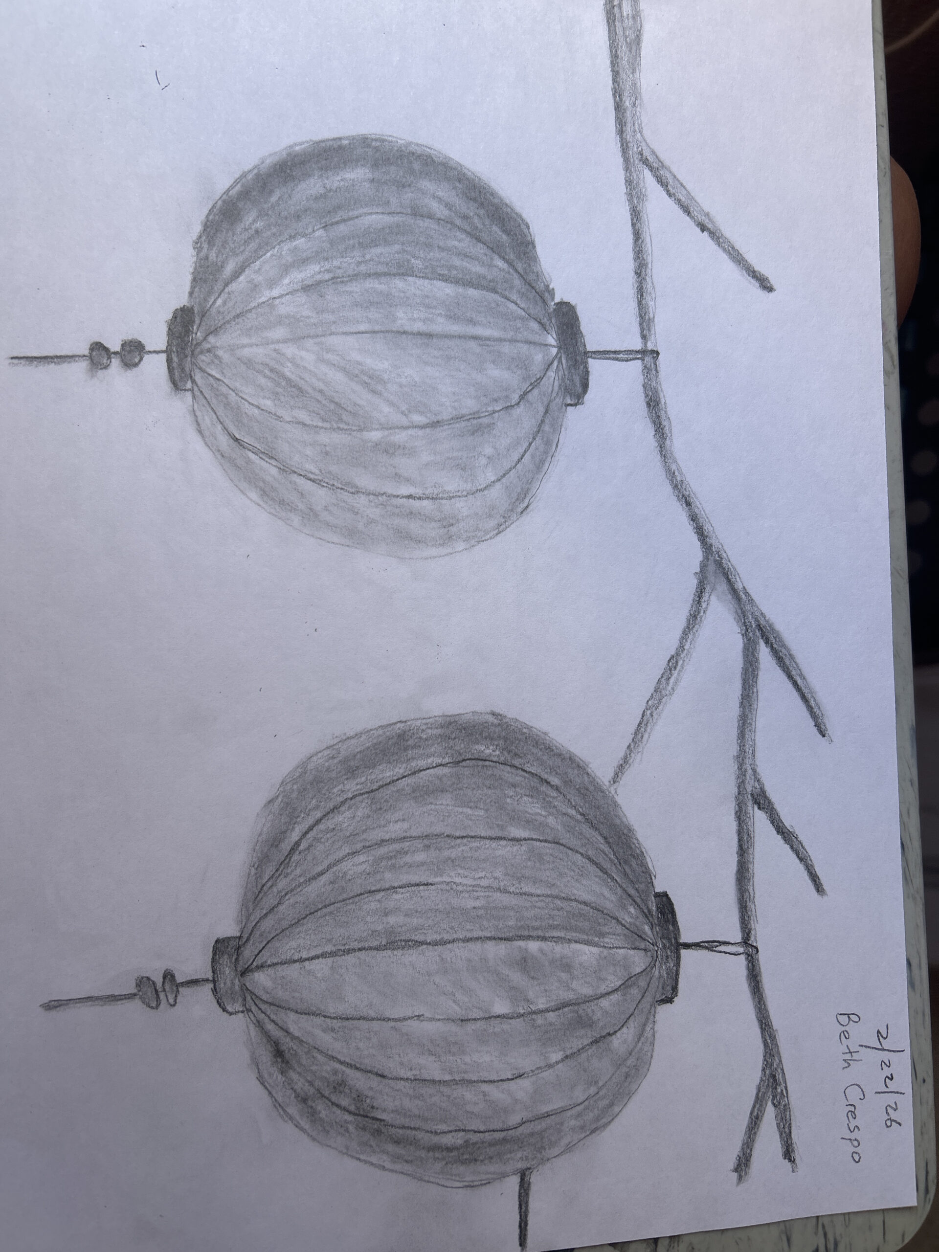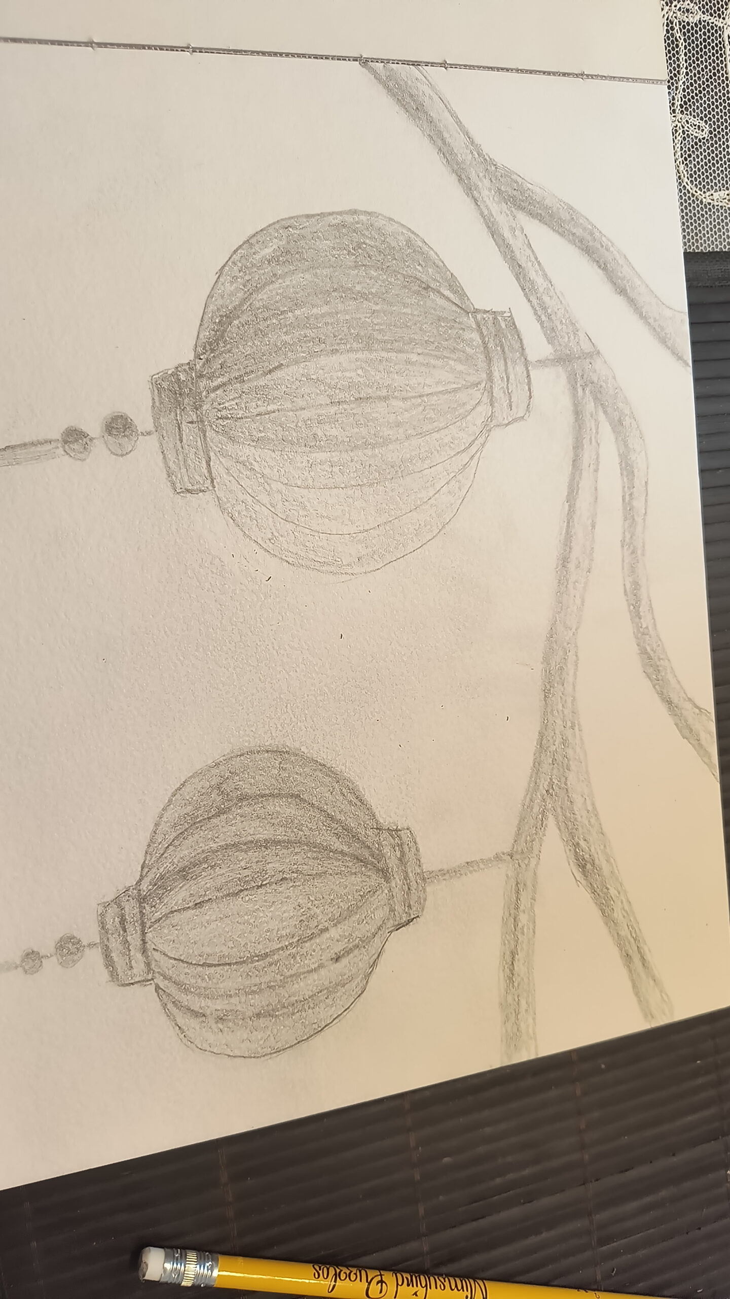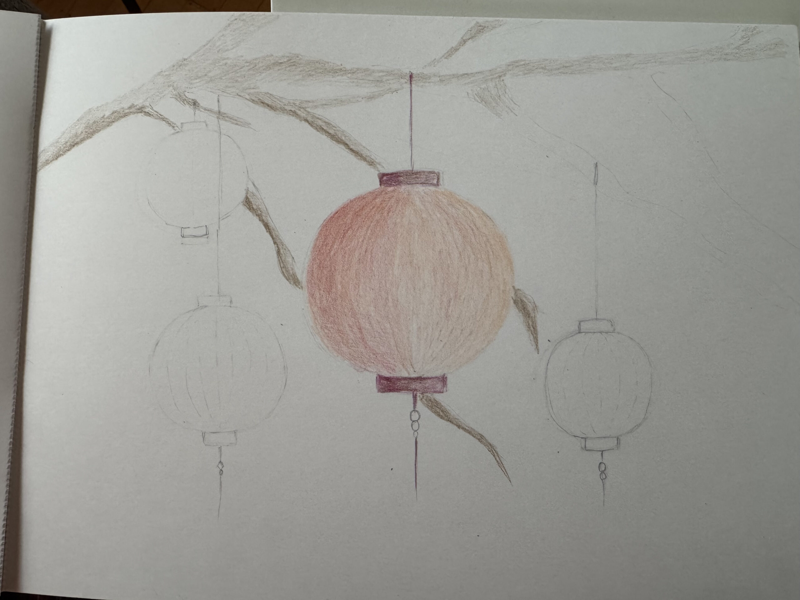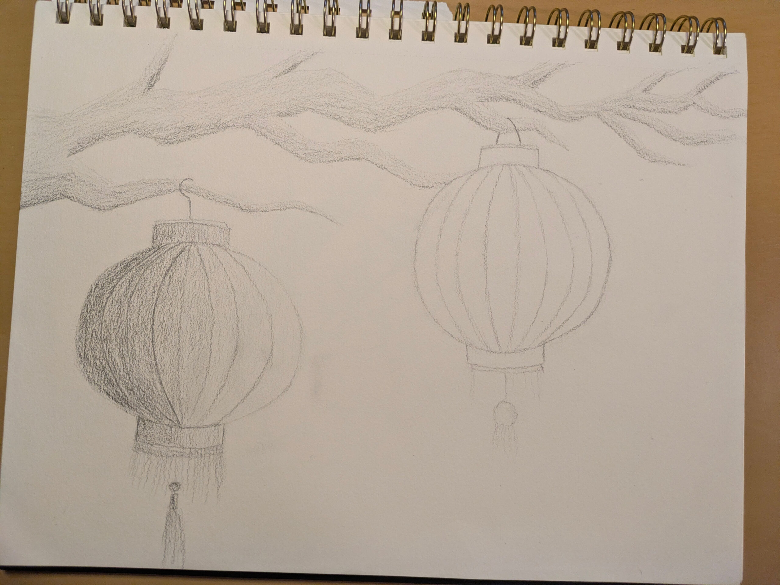 Oh my, Carr! You managed to capture such depth and dimension in your sketch, and the texture on your branch is amazing. Your lanterns seem to be blowing gently in the breeze. We are so glad you found the session relaxing and fun!