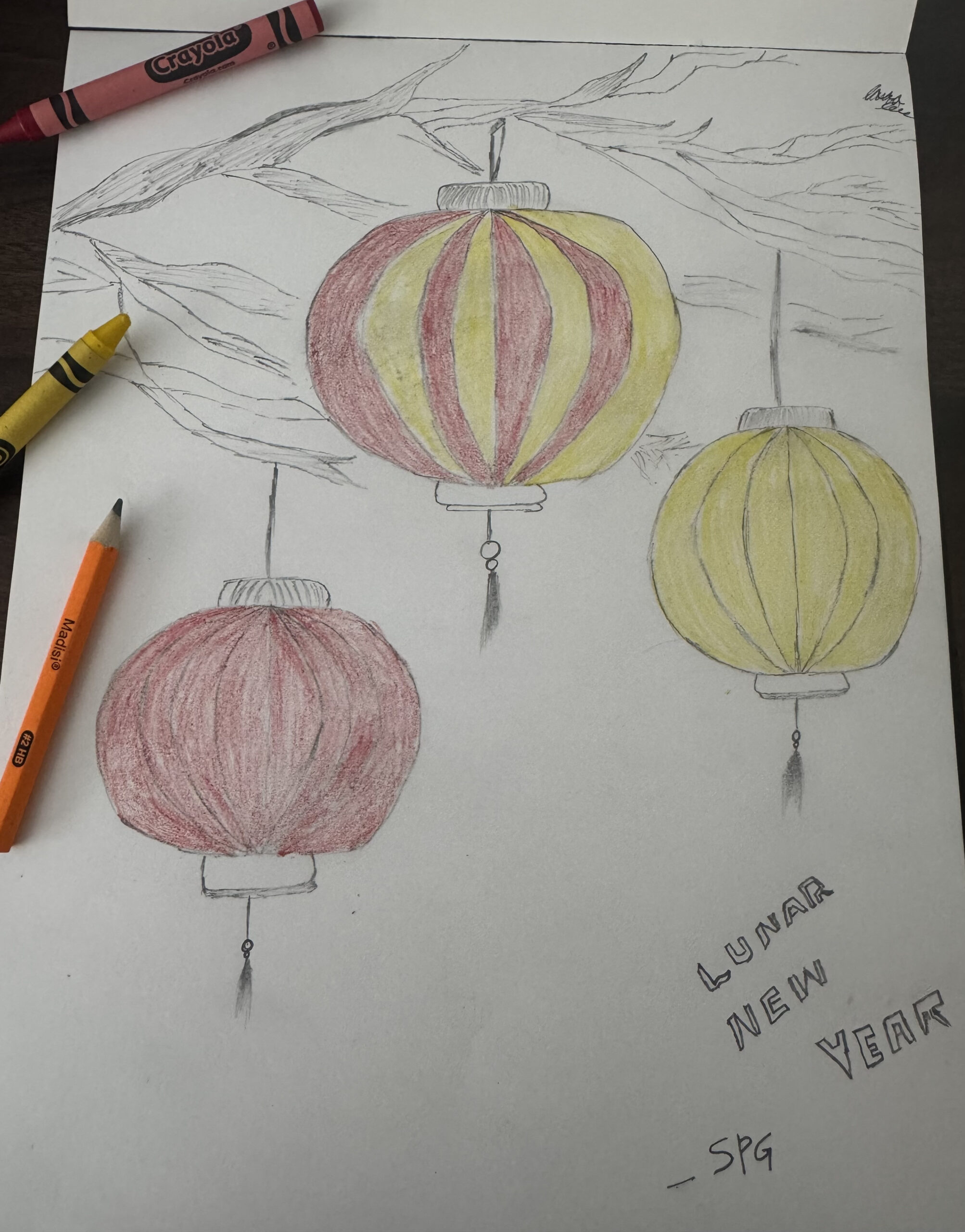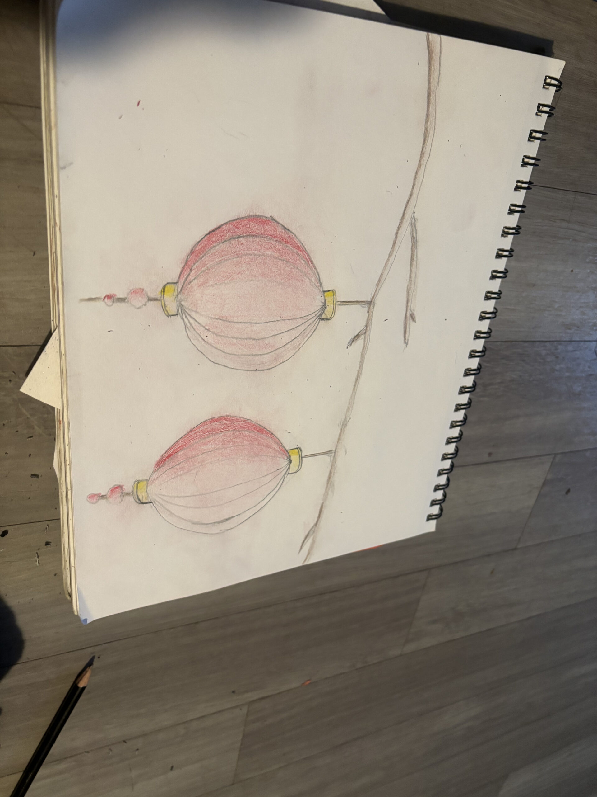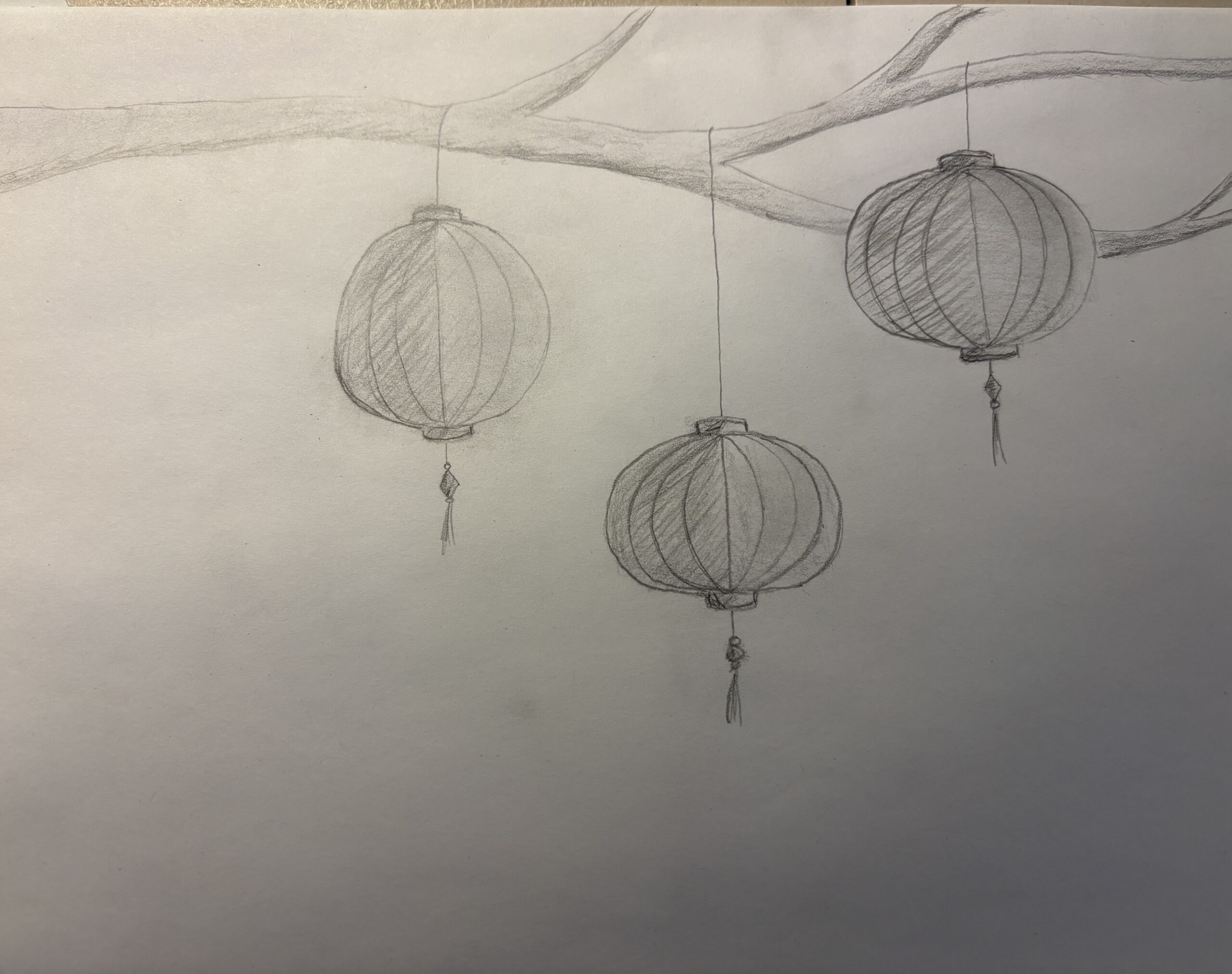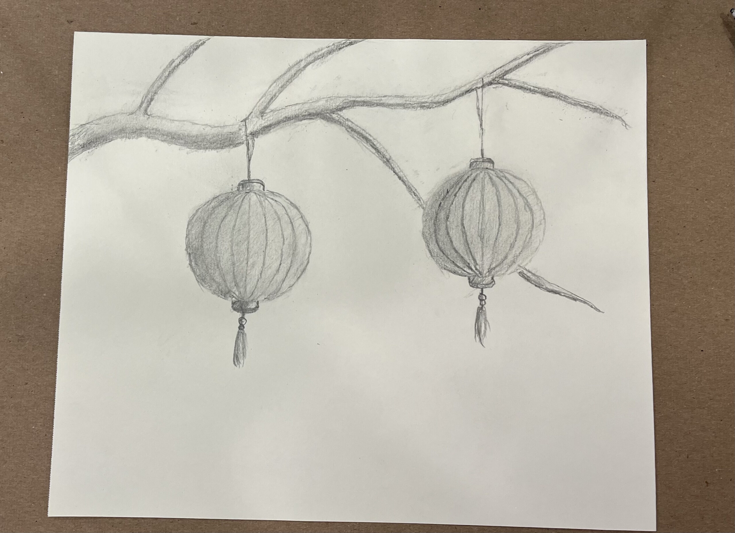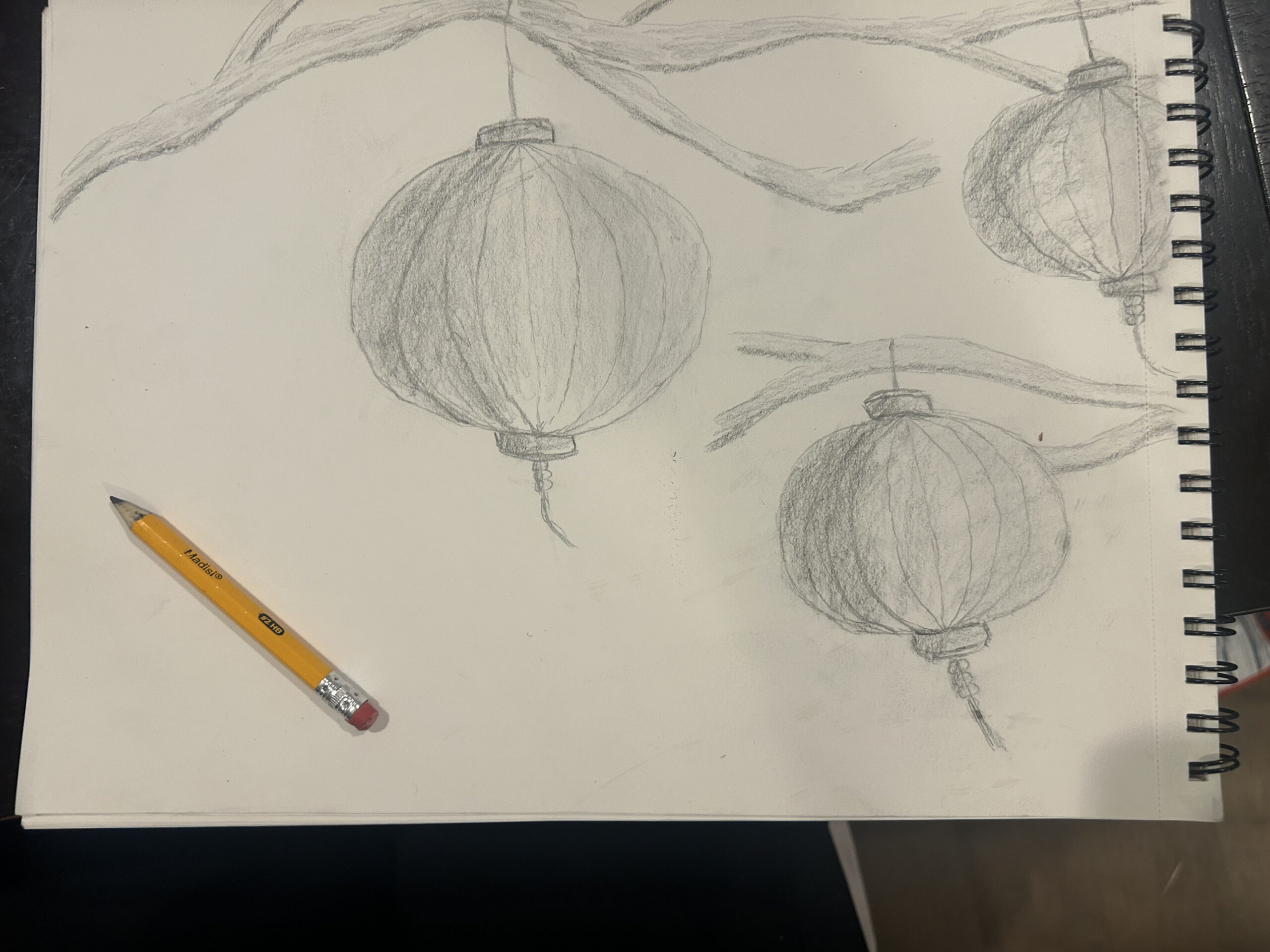 I used a splash of color today too, Marcus! (translate that to “I remembered to find my colored pencils before class) Happy Year of the Fire Horse to you! Nice work on your lanterns and the use of different shades of red to bring in the lighting. I also like the way you brought texture to your branch!
